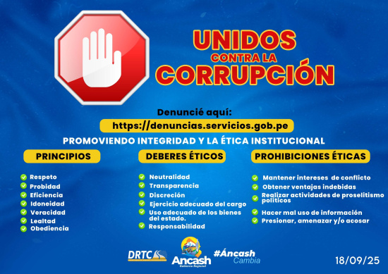 La Dirección Regional de Transportes y Comunicaciones de Áncash (DRTC Áncash) “Unidos contra la Corrupción”, con el objetivo de promover la integridad, la ética institucional y la transparencia en el ejercicio de la función pública. A través de esta iniciativa, se busca sensibilizar a los servidores públicos y a la ciudadanía sobre la importancia de actuar con probidad, eficiencia y veracidad, fortaleciendo así la confianza en las instituciones del Estado. La campaña resalta los principios éticos que deben guiar la labor pública —como el respeto, la lealtad y la obediencia—, junto con los deberes éticos de neutralidad, transparencia y uso adecuado de los bienes del Estado. Asimismo, recuerda las prohibiciones éticas, entre ellas evitar conflictos de interés, obtener ventajas indebidas o hacer mal uso de información institucional. Los ciudadanos pueden presentar denuncias sobre posibles actos de corrupción a través de la plataforma oficial del Estado: https://denuncias.servicios.gob.pe/?gobpe_id=769 https://www.gob.pe/21129-denunciar-un-presunto-acto-de-corrupcion?child=74120 Con esta acción, la DRTC Áncash reafirma su compromiso con la ética pública, la rendición de cuentas y la construcción de una gestión íntegra al servicio de la población ancashina.